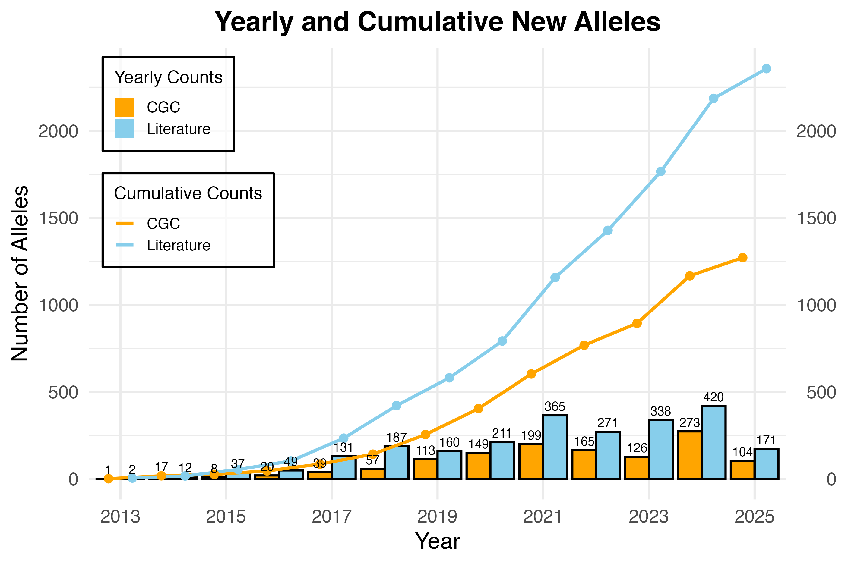 To generate this database, we first performed a keyword-based Textpresso search to identify papers likely to contain endogenously tagged strains. After manually reviewing 2502 published papers, we identified 779 that performed such knock-ins, and extracted all reported endogenously tagged alleles. Analysis of the dataset's discovery curve indicates ~90% of all unique genes with published endogenous tags were captured. This list was then supplemented with strains available through the CGC. We invite researchers to submit their alleles to the database to make it more complete.